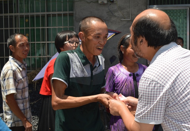 罗校长将3000元文军奖学金交到陆庭的父亲手中