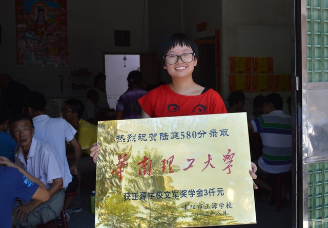 2007年从耒阳浔江曹流小学考入正源学校奥赛班,后进入清华班学习的陆庭同学,在正源初中2年加高中4年的学习,今年高考580分,考入华南理工大学,就读机械电子工程专业。