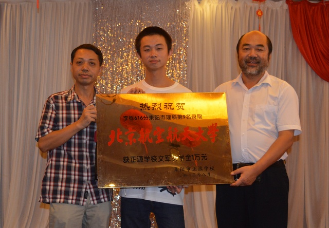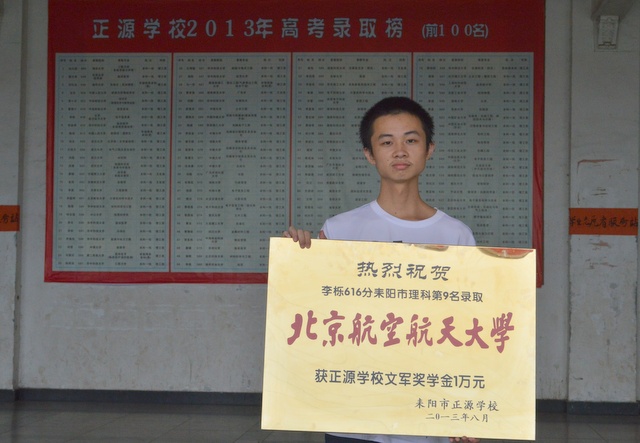 7月25日正源学校2013年高考庆功会上,李栎获得了学校“文军奖学金”10000元。