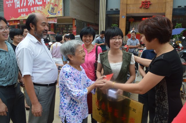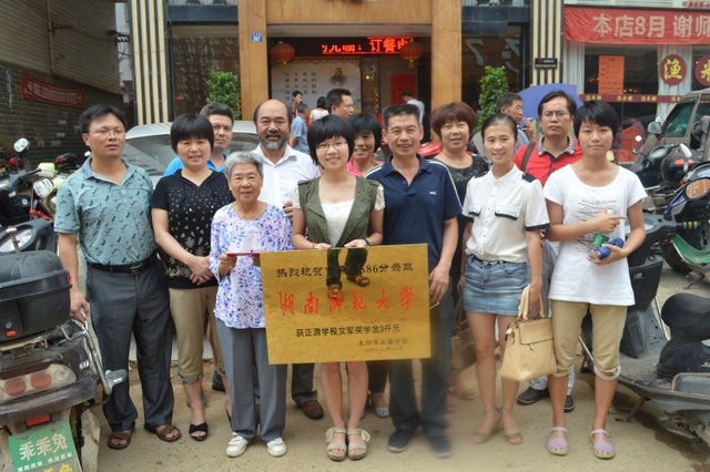 应多位家长的盛情邀请,罗校长率学校部分老师首先赶往耒阳市白云路“百姓厨房”酒家,为考入武汉大学的吴俊同学颁发奖牌,并与吴俊及其家人合影。接着赶往耒阳市白云路“明德食府”酒家,祝贺考入湖南师范大学的曹希茜同学。学校董事梁晓芬女士为曹希茜颁发了奖金和奖牌。之后,罗校长一行赶往耒阳市“龙凤”酒家,为考入华中科技大学的李乐同学祝贺。