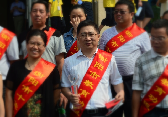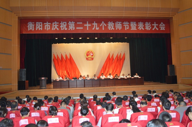 为庆祝第29个教师节,在全社会弘扬尊师重教、尊重知识、尊重人才的良好风尚,促进教育事业更快更好发展,衡阳市人才资源和社会保障局、衡阳市教育局、衡阳市教育基金会、衡阳市教育工会,隆重举行了衡阳市“庆祝第29个教师节暨表彰大会”。大会表彰了衡阳市教育界先进个人,并希望受表彰者再接再厉,不断进取,为衡阳教育改革作出新的贡献。大会授予了6位同志衡阳市“教育功臣”荣誉称号;10位同志衡阳市“十佳校长”荣誉称号;10位同志衡阳市“十佳乡村教师”荣誉称号;10位同志衡阳市“十佳班主任”荣誉称号。