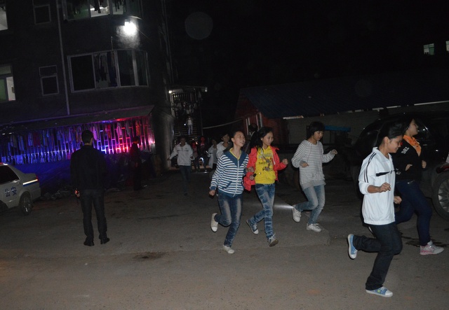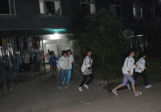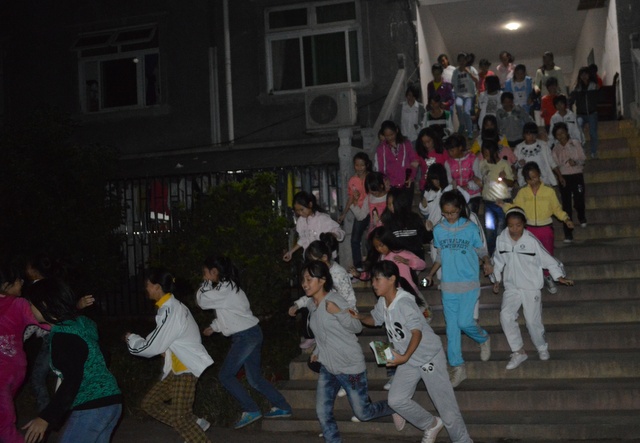 晚上7点25分,第二次演练开始。整栋宿舍楼已熄灯,学生们手拿电筒从宿舍楼内跑出,用时6分16秒。用时间比第一次演练少十几秒。整个过程较为规范、组织有序。学生在跑出的过程中没有出现明显拥堵和明显浪费时间的现象。