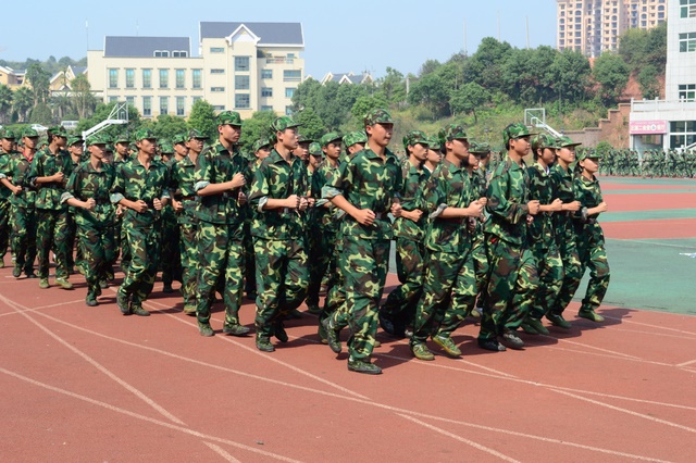 今天天气晴朗,最高温度32℃。我校高一年级、初一年级新生军训进入第五天。今天军训的内容是跑步停止间转法、整齐报数、敬礼、三大步伐、内务整理。