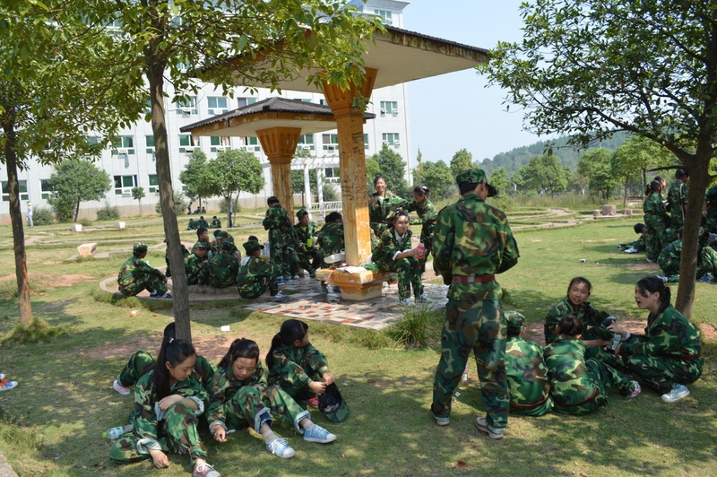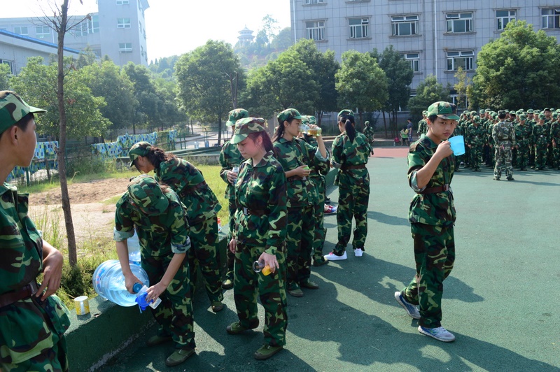 上午和下午军训的内容是三大步伐。军训场地上训练进行得热火朝天,口令声此起彼伏。他们或以班为单位,或以列为单位,在训练场地上进行着训练。还有的同学在休息时间帮助同学纠正着动作,教的同学很认真,学的同学也很认真。同学们在太阳底下进行着训练,头发被汗水沾湿了,衣服上也是一片片被汗水沾湿的痕迹。老师们也为学生们做着服务工作。不少老师衣服都被汗水沾湿了,仍坚持在太阳底下和同学们在一起,帮助同学们进行军训。在训练场地的边沿,学校准备着给学生喝的凉茶,每个班的饮水桶旁边都整齐摆放着同学们的饮水杯。