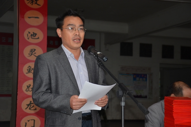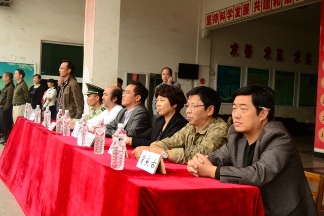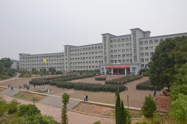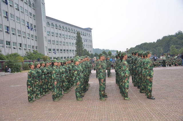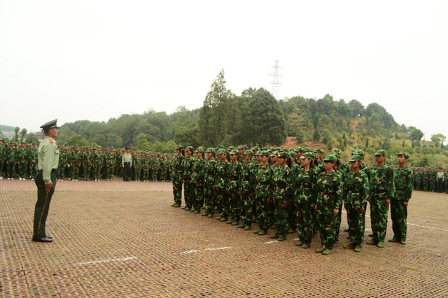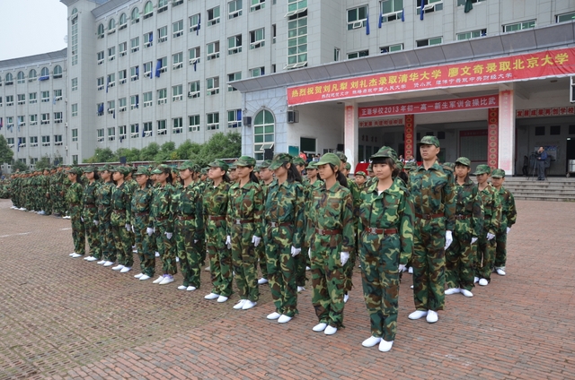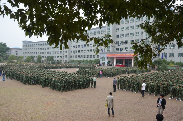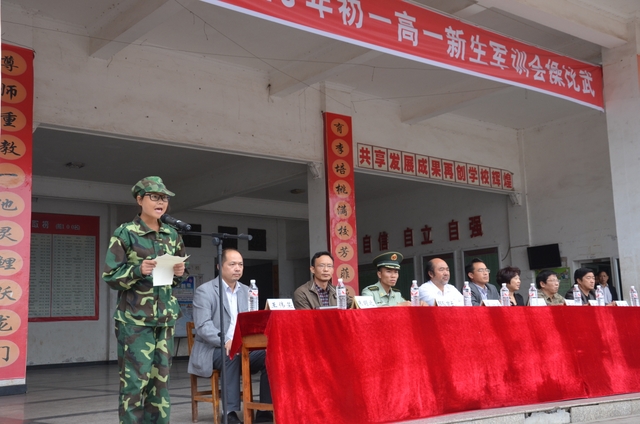 10月15日下午,气温骤降,天气变冷,但学校教学楼前广场却热火朝天,喜气洋洋,2013年秋季初一年级、高一年级新生军训会操比武在这里隆重举行。罗湘云、总教官、毛小波、梁晓芬、王伟荣、朱明之、黄建新、曾良古等领导在主席台就坐。59个教学班3298名军训学员,以班为单位全部参加了会操比武。