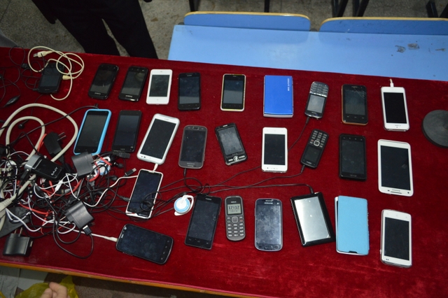会议室主席台上摆放着34部手机和一些手机充电器,还有mp3、mp4、热得快、电子词典、电源插座等。10月27日凌晨1点到2点30分,罗校长住着高中部学生的5号宿舍楼及高中部教学楼进行了突击检查。寝室里,绝大部分同学进入了梦乡。但是,在又黑又静的宿舍里,几乎每个寝室里都有使用中的手机屏幕微弱的亮光,在黑暗中清晰可辨。这种场面让校长感到震惊。罗校长以每两分钟一只手机的查缴速度,在20个寝室中缴获手机34部,还有其它电子产品,其中三个电源插座互相串联着藏在床底下或被窝里,极易引起火灾。2点10分,在高三39班教室,又查获两个同学未按时就寝,其中一人在讲台上玩电脑。查缴的34部手机中,高三年级的学生占了29部。