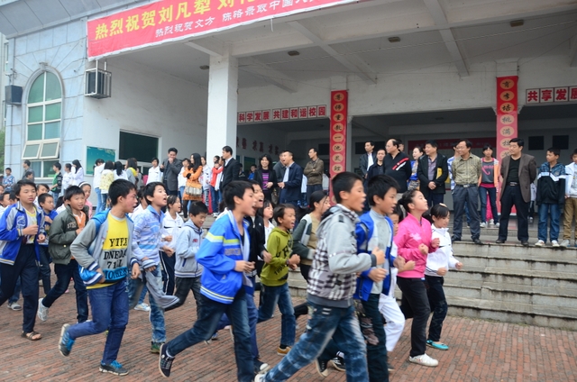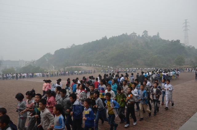 正源学生跑操(广场上是中学生, 远处从山中跑出来的是小学生)