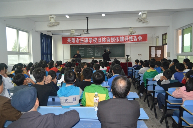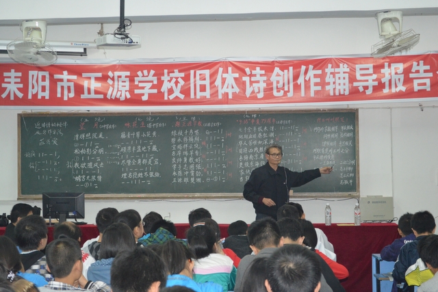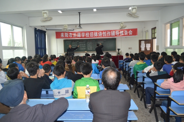 继9月26日我校举行旧体诗创作辅导报告会之后,时隔月余,今天下午,再次请来耒阳市诗词楹联协会的老师为准高一的部分班级进行了专场辅导。