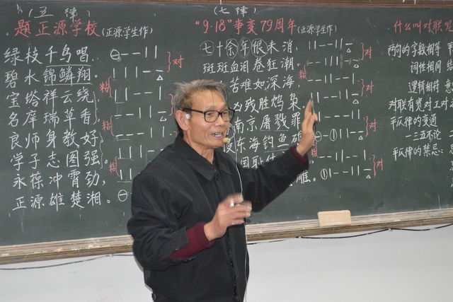 今天的主讲老师是蒋传爱,题目是《旧体诗的格律及写作方法》。参加听课的是高75班和高84班的学生。蒋老师就近取材,以原获奖作品,正源学校学生的一首五律《题正源学校》、七律《9.18事变79周年》,和耒阳二中学生的五绝《望月》、蔡子池中学学生的五律《咏花生》,讲解了几种常见旧体诗的基本规则和写作方法。由于是身边的同学的作品,写的又是身边熟识的事物,同学们听得认真,记得仔细,对蒋老师的讲课爆以热烈的掌声。