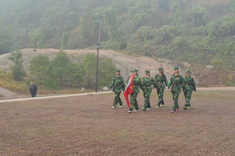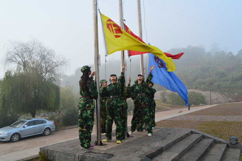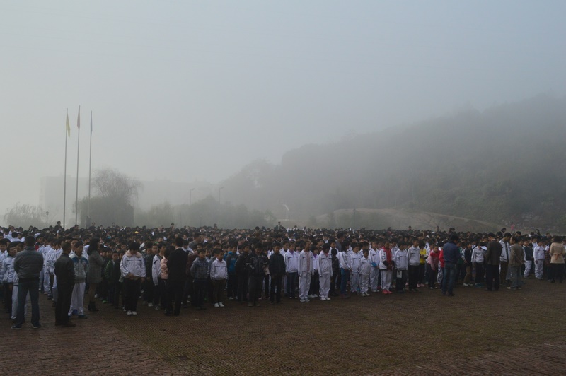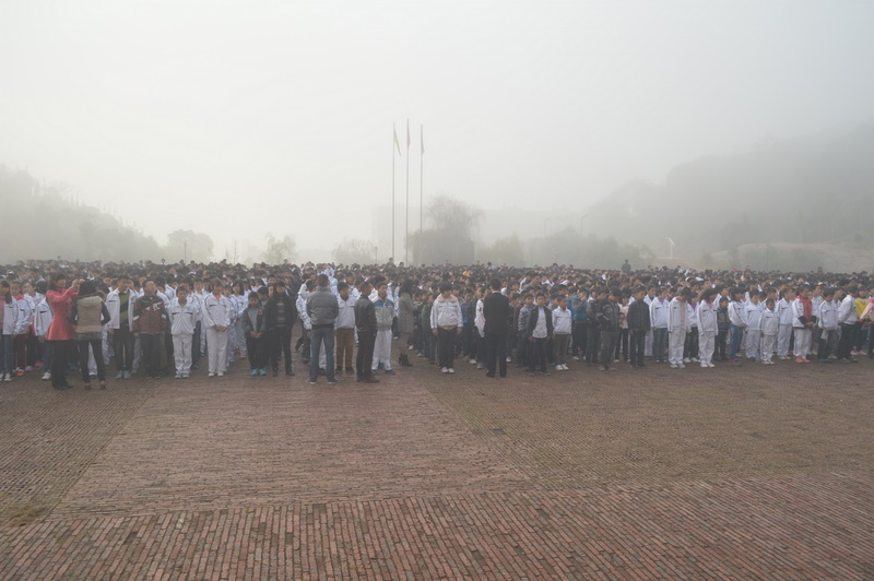 上午八时许,浓雾笼罩。期中质量监测前夕,小学部今天隆重举行升国旗仪式。