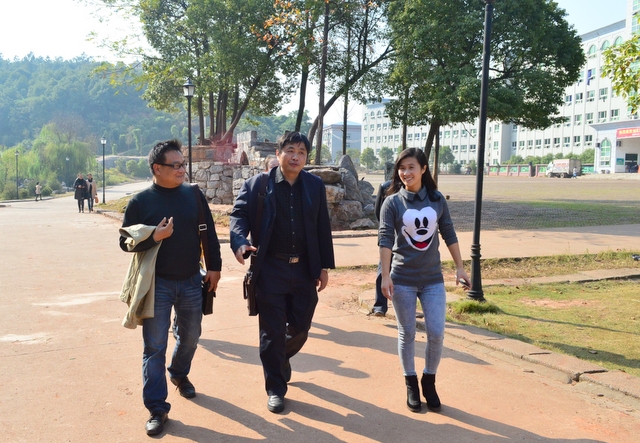 龙池实验中学校长钟自力(中)、副校长刘亦武(左)在招生办主任李丰(右)引导下参观校园