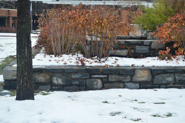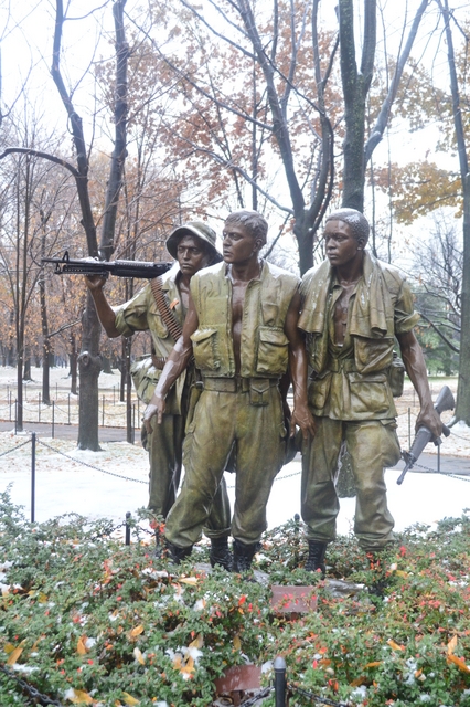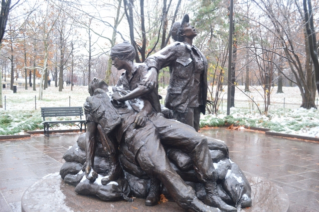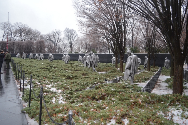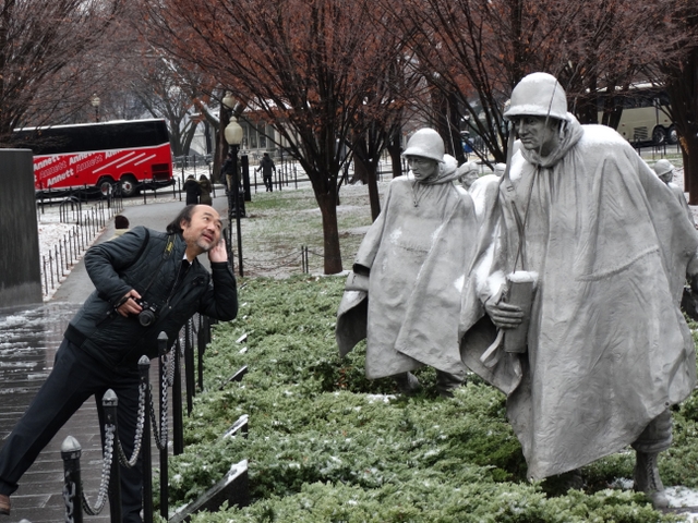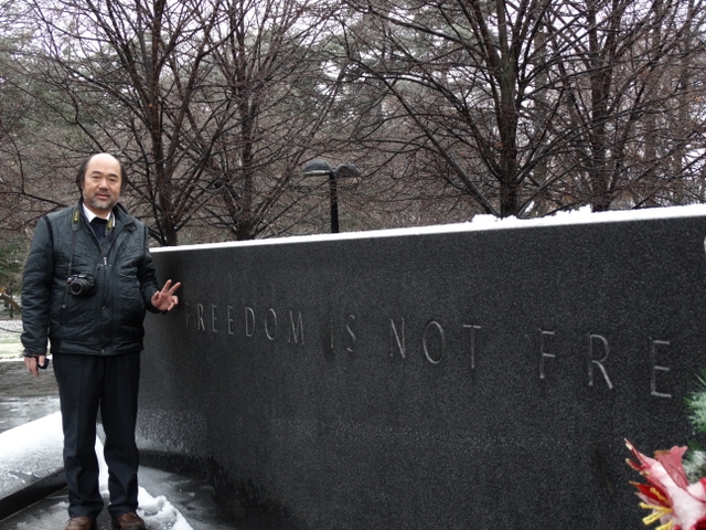 不知是不是老兵,在雪中毕恭毕敬的面对Freedom is not free石墙站立着