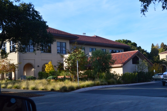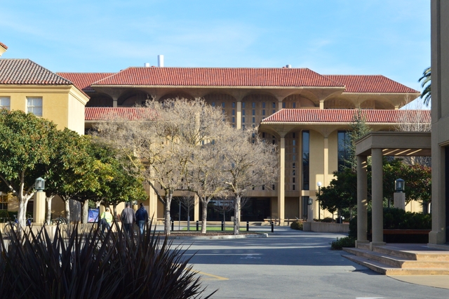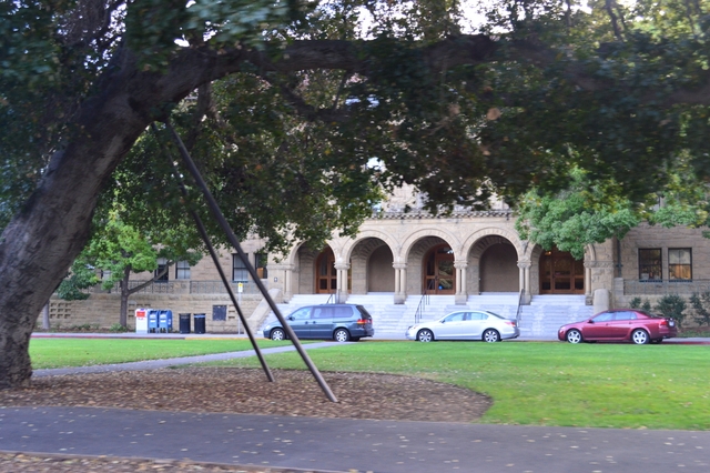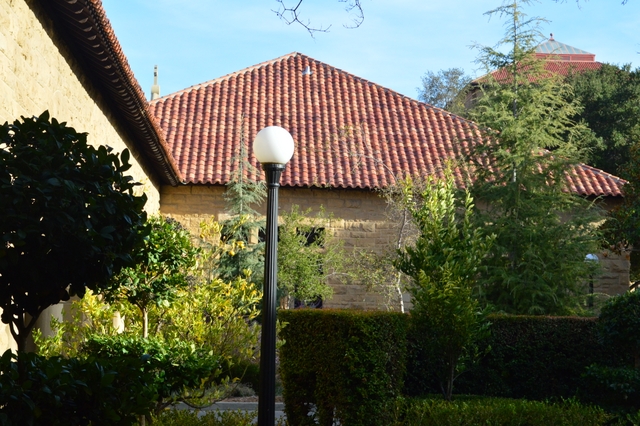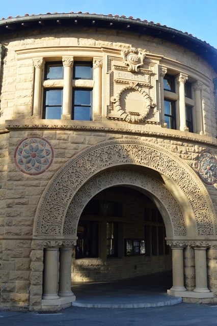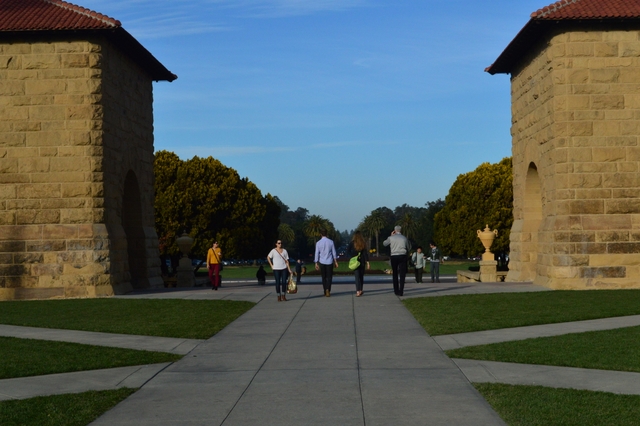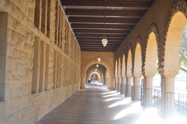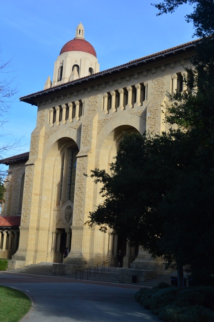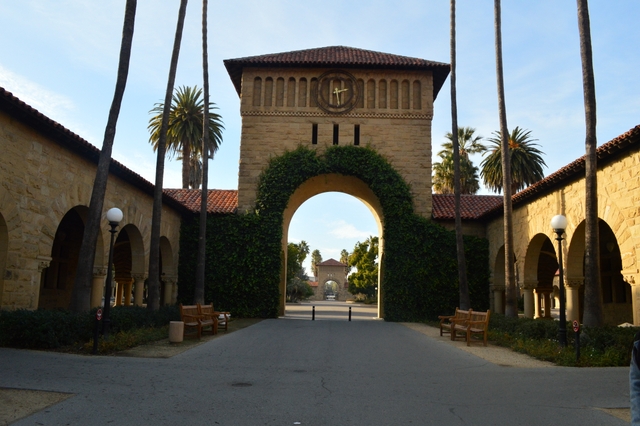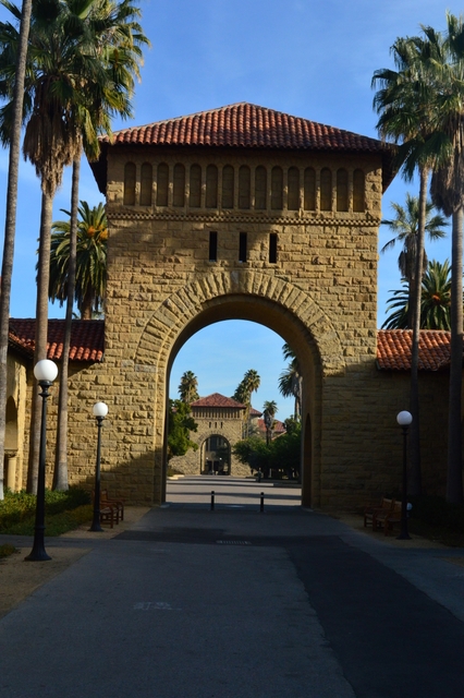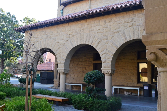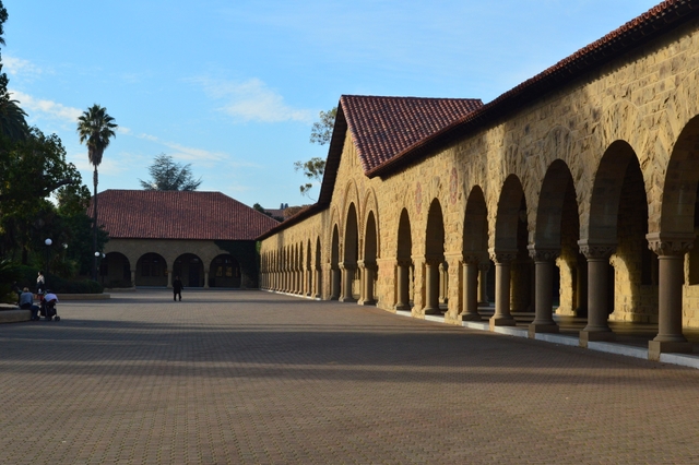 斯坦福大学的楼房都是黄砖红瓦,四平八稳,一律是十七世纪西班牙的传道堂式——没有哈佛、耶鲁大学那些年代不同、风格各异的楼房,更少了东北部大学墙壁上爬满的常春藤,进入大学,首先看到的是土黄色石墙环绕下的红屋顶建筑,拱廊相接,棕枷成行,在古典与现代的交映中充满了浓浓的文化和学术气息。