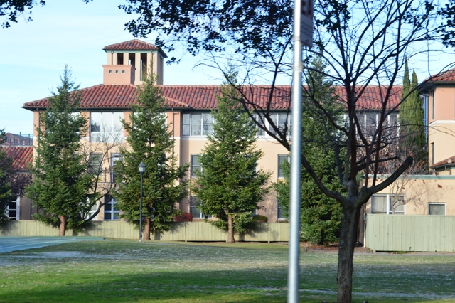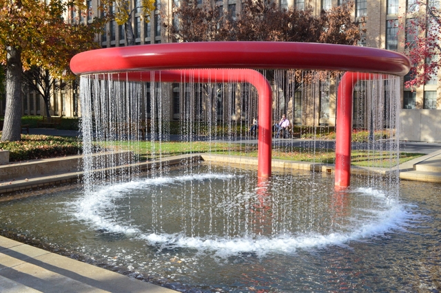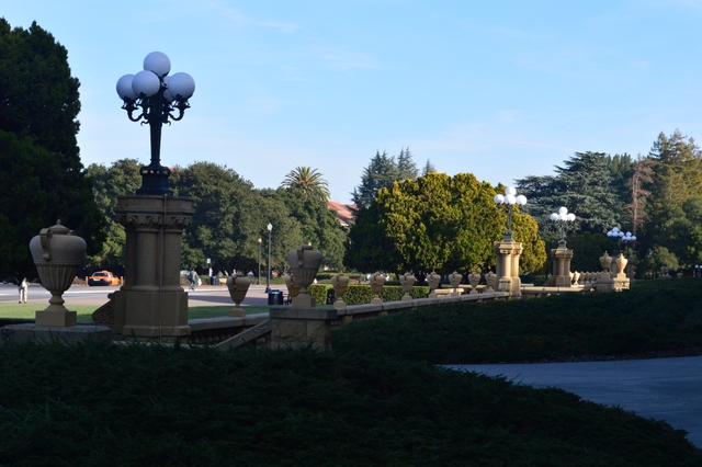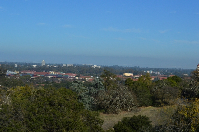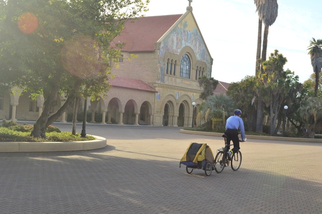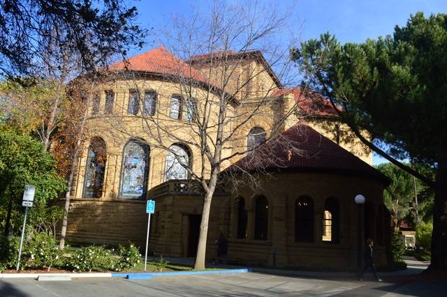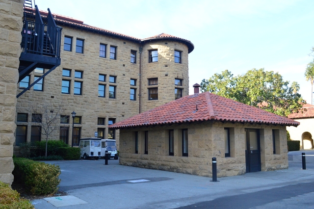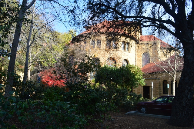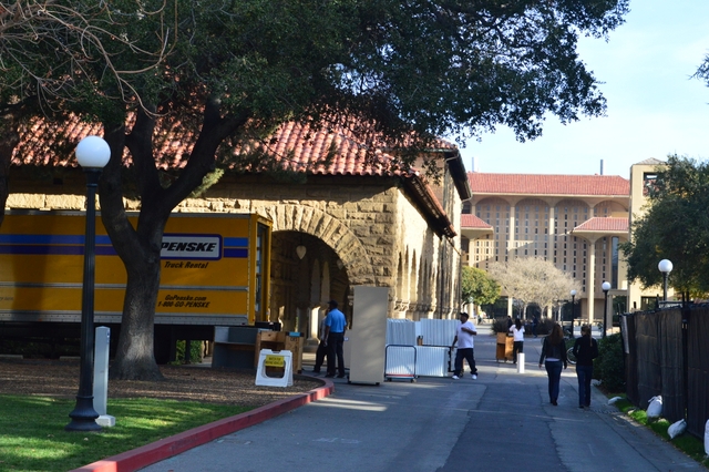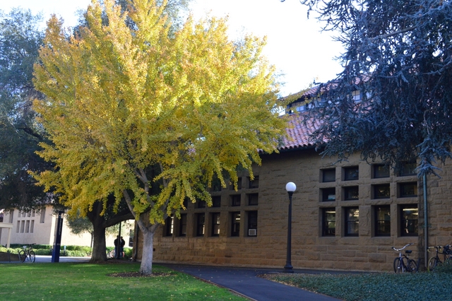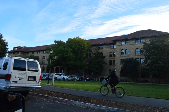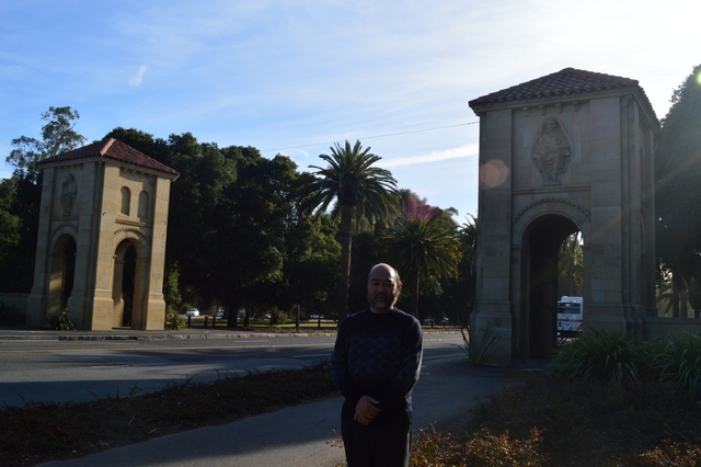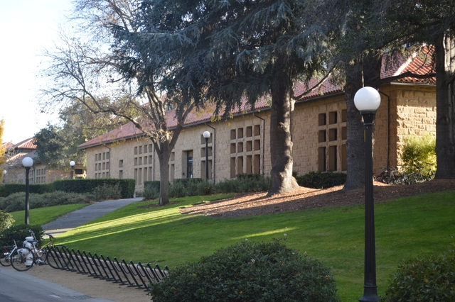 斯坦福大学的楼房都是黄砖红瓦,四平八稳,一律是十七世纪西班牙的传道堂式——没有哈佛、耶鲁大学那些年代不同、风格各异的楼房,更少了东北部大学墙壁上爬满的常春藤,进入大学,首先看到的是土黄色石墙环绕下的红屋顶建筑,拱廊相接,棕枷成行,在古典与现代的交映中充满了浓浓的文化和学术气息。