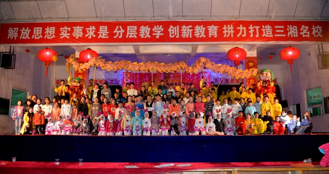 教学楼大厅上方,一条“解放思想,实事求是,分层教学,创新教育,拼力打造三湘一流名校”的巨大横幅特别引人注目,横幅下面均匀悬挂了四盏大红灯笼,大厅两侧“青龙挥巨笔频书状元神话 黑马奋劲蹄再谱正源华章”的对联表达着正源人的成就感和豪迈激情。大厅中央背景布上的“2014”四个艺术字造型成一匹奔腾的骏马,既体现出即将到来的一年按十二生肖属于马年,更象征着正源人在新的一年里会像一匹黑色的骏马,一往无前,马到成功,取得不断令人刮目相看的成就。