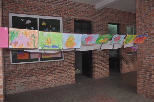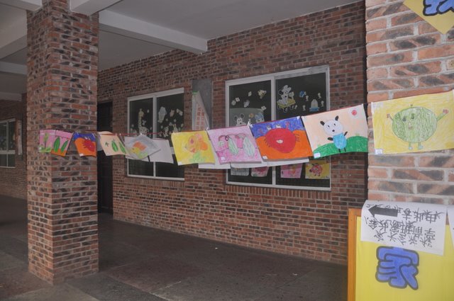 早上8点开始,家长们陆陆续续来到学校。家长们一走近学前班教室,横挂在教学楼一楼各廊柱之间的一长排学生绘画作品映入眼帘。有26 班黎轩同学的《 海底世界 》,有 27 班王童颜同学的《 毛毛虫 》,有28 班黄俊霖同学的《 粉红小猪 》,有29 班谢佩研 同学的《 向日葵 》,形式多样,题材丰富,惟妙惟肖,充分表现出了同学们天真的观察力、丰富的想象力和可喜的表现力。黄俊霖同学的奶奶看到自己的孙子也能画出这么像模像样的作品,高兴地对老师说:感谢你们的悉心教导,我的孙子在这里收获真大。