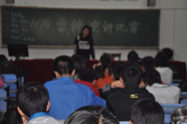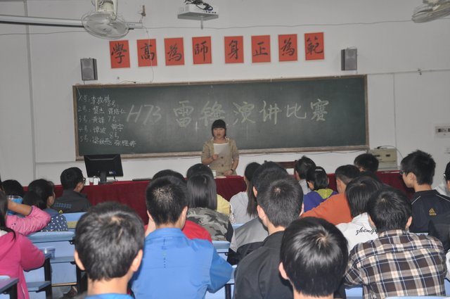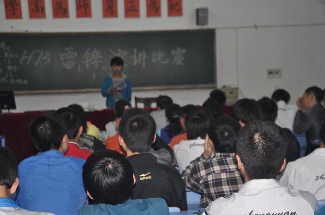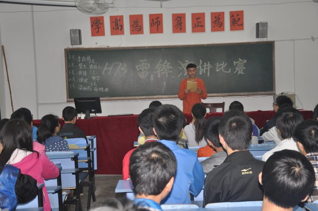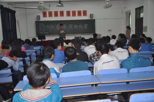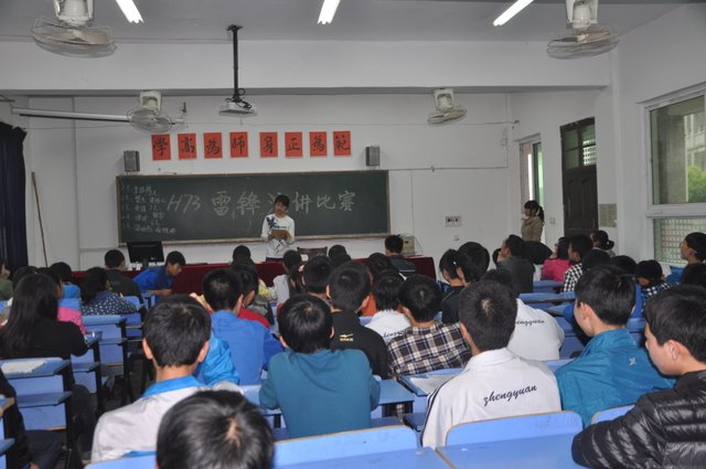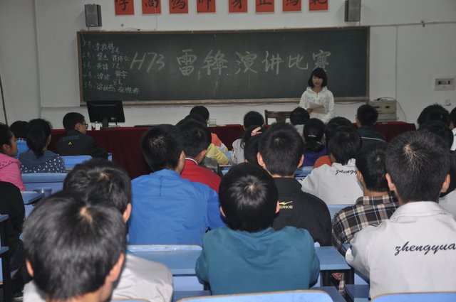演讲会由该班班长刘诺梦主持,李孜骐、黎杰、黄锋、谭波、梁秋燕、蒋培仁、黄宇、张雅婷八位同学相继登台角逐。同学们的演讲,既生动讲述了五十多年前雷锋的真实故事,阐明了雷锋的种种精神,又列举了当代一个一个活雷锋的感人事迹,传递出积极的正能量。尤其是张雅婷同学,昨天才被推举参加演讲比赛,没有时间充分准备,今天是即兴演讲,沉着镇定,从容不迫,以同学们之间的争吵、打斗等不良现象与雷锋相对照,突出“雷锋——那个给生活无尽宽容的人”这一主题,深深地打动了听众,赢得热烈掌声。