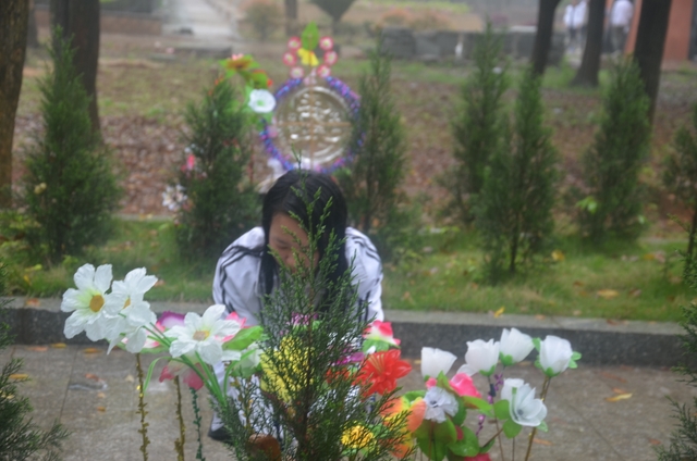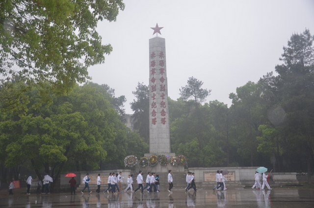 在烈士陵园,中雨没有一刻停止。同学们来到烈士雕像、纪念碑、烈士墓前,虔诚地献上花圈和鲜花,表达对革命先烈的无限敬仰和缅怀之情。