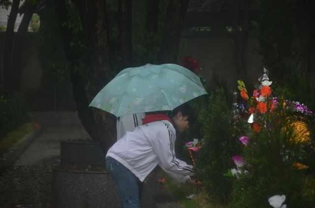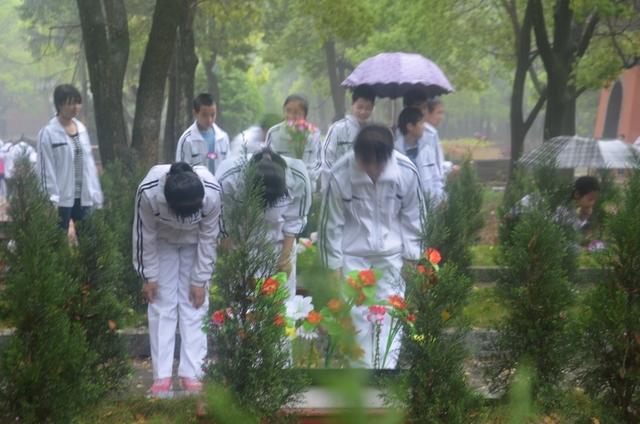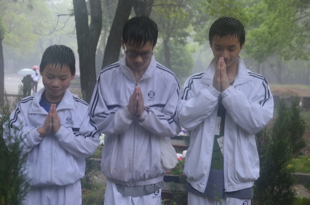 人神共敬,天地同悲。祭扫队伍刚出学校一公里多路,便下起了中雨。雨水淋湿了同学们的衣裳,但丝毫没有淋湿同学们的热情。没有任何怨言,没有一人退却。同学们边走边等校车。校车来后,一部分同学上了校车,一部分同学冒雨坚持走到了烈士陵园。