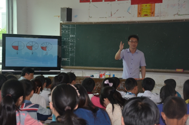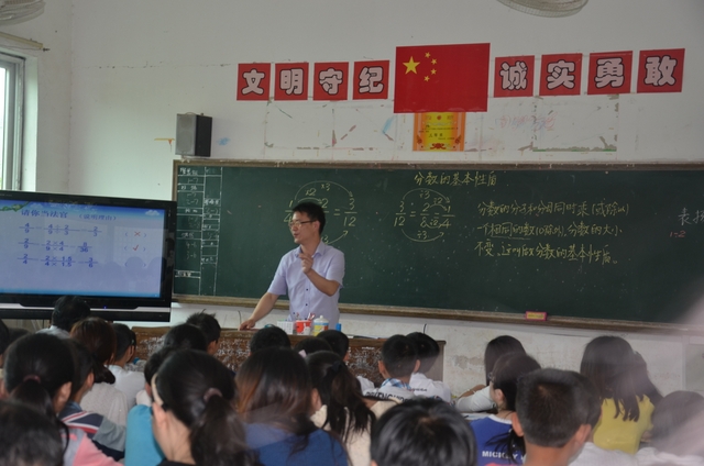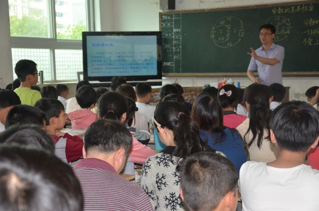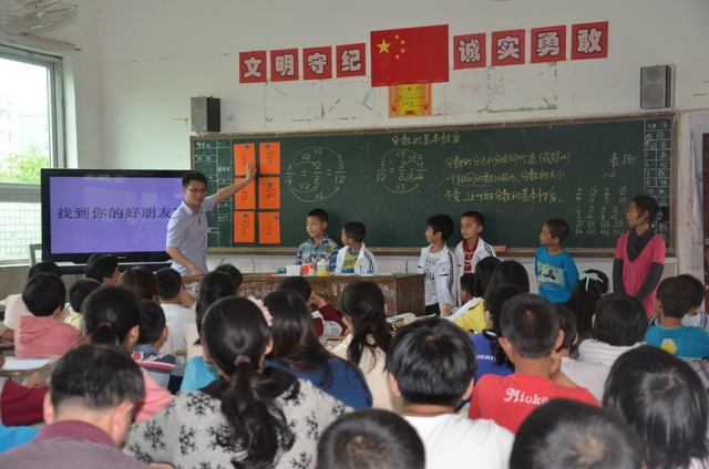 上午第三节课,罗小青老师在五年级73班执教《分数的基本性质》一课。罗老师首先出示三个圆形中各自为四分之一、八分之二、十二分之三的三幅图片,让学生比较它们的面积大小,从而得出分数的基本性质,板书其内容和课题。再通过“我能讲故事”、“请你当法官”、“大家试一试”、“各自找朋友”等环节,循循善诱,环环相扣,举一反三,让学生当堂训练,当场收获,牢固记忆,掌握技能。整节课中心明确,重点突出,不蔓不枝,结构合理。教师讲课抑扬顿挫,从容不迫,疾徐有致,引人入胜。学生注意力集中,思维活跃,发言积极,互动充分。