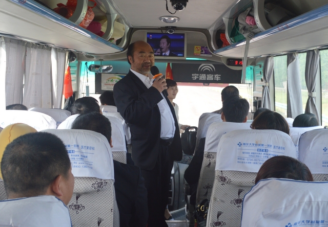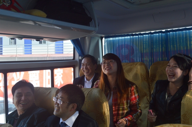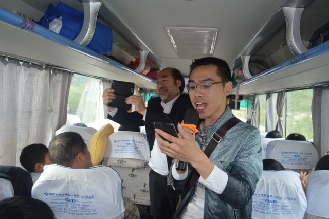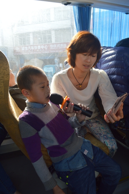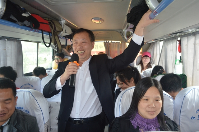早餐后,八点启程。这时,罗校长等人来到了八号车上。顿时,车上响起了热烈掌声。罗校长、梁晓芬财务总监和大家一起联欢。罗校长激情满怀,以一曲《敢问路在何方》拉开帷幕,接下来唱了梁总监和女老师们《幸福不是毛毛雨》 《回了家》,罗校长和梁总监又合唱京剧《智取威虎山》选段《我们是工农子弟兵》,小孩子们也唱起了《爸爸去哪儿》。整个车内充满欢声笑语,其乐融融。