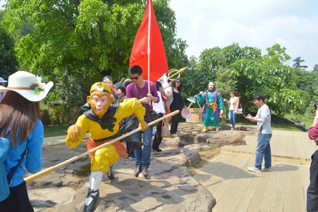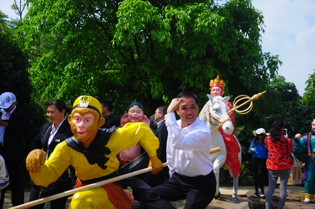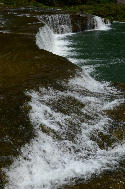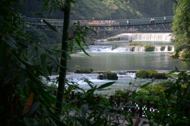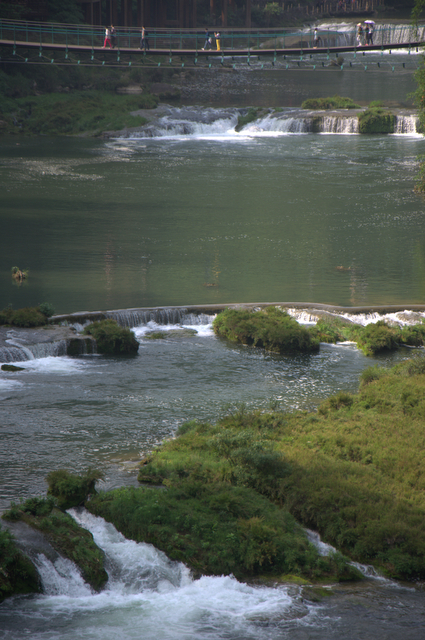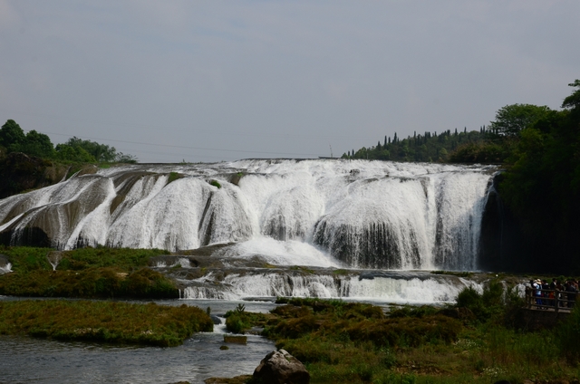 上午约十点,我们来到黄果树景区。首先参观的是“陡坡塘瀑布”。这里就是1982版《西游记》拍摄插曲《敢问路在何方》的地方。一进园门不远,就是悟空开路、唐僧骑马、八戒随行、沙僧挑担,师徒四人西行取经的场景,立马吸引了大批游客,纷纷在这里取景留影。再沿着路标往前走,渐渐地,右边一道瀑布就出现在眼前。瀑布有两重,落差虽然不是很大,据说,却是整个景区最宽的一道瀑布。
