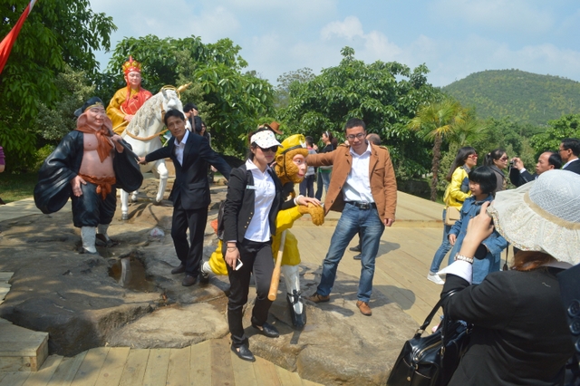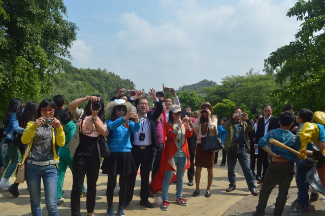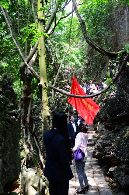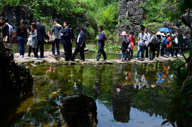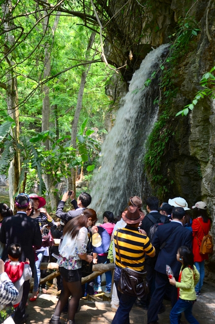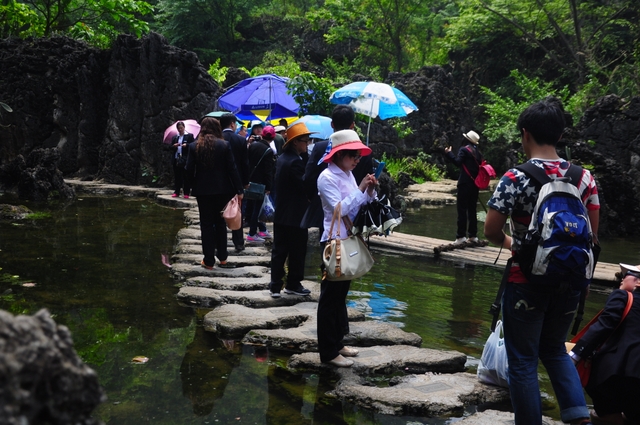 走出陡坡塘瀑布景区,来到“天星桥景区”。这里有水上石林、天然盆景之美称。顽石突兀而起,星罗棋布。一路踏着嵌有中外名人名字的铁板、按照一年时间内他们生日的先后顺序排列的石路,欣赏喀斯特溶洞奇观“天星洞”、惟妙惟肖的美女榕、猪八戒高老庄背媳妇的“天星湖”,等等,人们流连忘返,预定一个半小时的两个景区,竟到下午一点多钟才出来吃午饭。