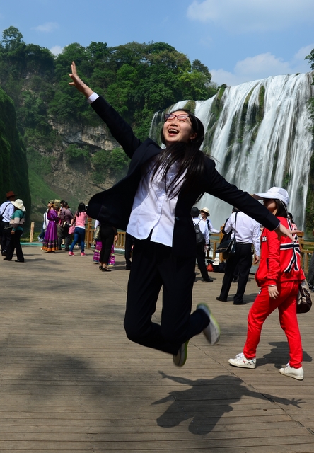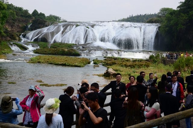 午饭后,在黄果树景区正门前集体合影。然后进入景区,首先映入眼帘的是一盆盆造型奇异的盆景,五花八门。沿路走过去,渐渐地,亚洲第一大瀑布——黄果树瀑布呈现在人们眼前。人们从前后左右、上下里外不同的角度来欣赏。越近,瀑布声音越大,冷气也越大。在最近的一个平台上,人们能感受到对面溅飞过来的雨星。几位老师逸兴壮飞,跳起来,摄影师抢拍下一个个精彩瞬间。