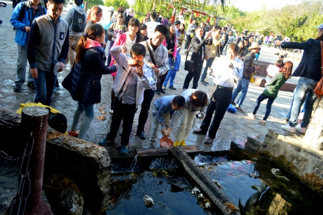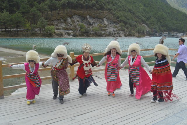 早上七时许,客车出发。行车约40分钟,到达今天的第一个景区:玉水寨。这里是丽水的发源地,也是纳西人顶礼膜拜的地方。里面有纳西人金身偶像图腾、雄性生殖器图腾,有东巴庙、东巴什罗殿等,老师们争先恐后在这里拍照留念。