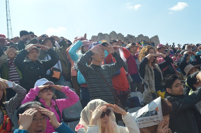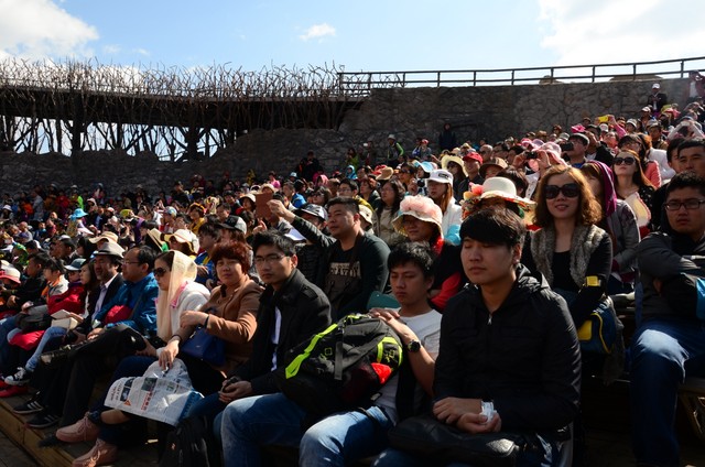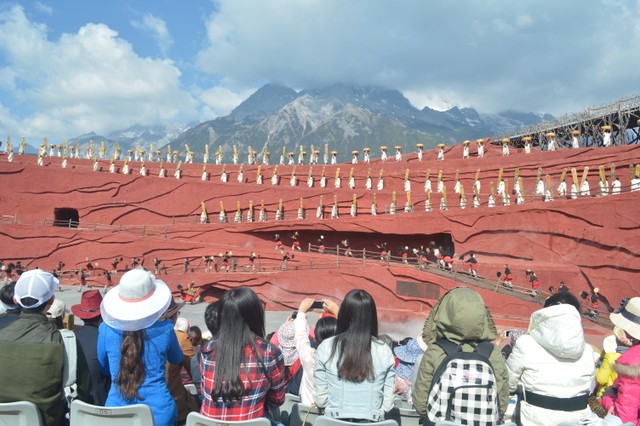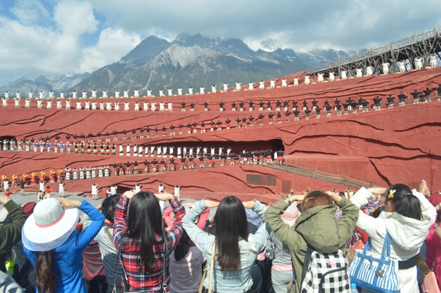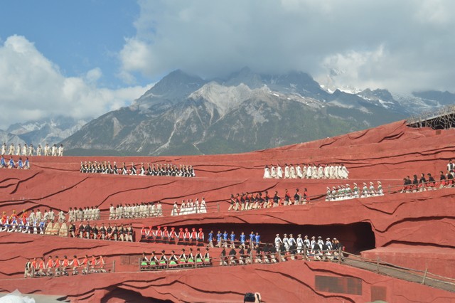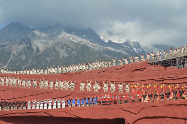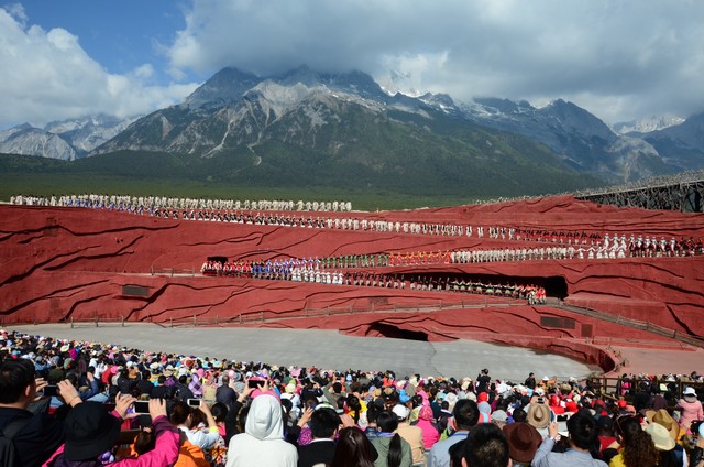 约九时,我们来到《印象丽江》场地,观看由著名导演张艺谋执导的这部大型实景歌舞。场景开阔,气势恢宏,威风锣鼓等音乐令人震撼,几百人同时出场的场面尤为壮观。歌舞再现了纳西人历史渊源、风俗人情,以及奋斗历程,给人以强烈的艺术感染力。