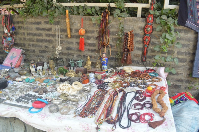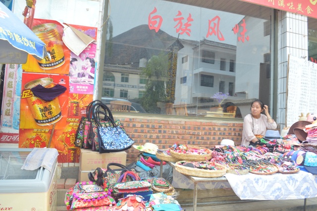 十一点一刻,驱车赴双廊玉玑岛。这里也被称为南诏风情岛,是著名白族舞蹈家杨丽萍的家乡。漫步在具有四千年悠久历史的白族渔村,尽享“目极湖山千里外,人在水天一色中”的美景。这里也是著名银饰艺人寸发标的家乡,他的九龙酒具是国宝级别珍品,是国际交往中珍贵的赠品。走在古镇上,银饰店铺比比皆是。精美的银制品琳琅满目,吸引着人们的眼球,自觉和不自觉中,买下一件件价格不菲的礼品和纪念品。