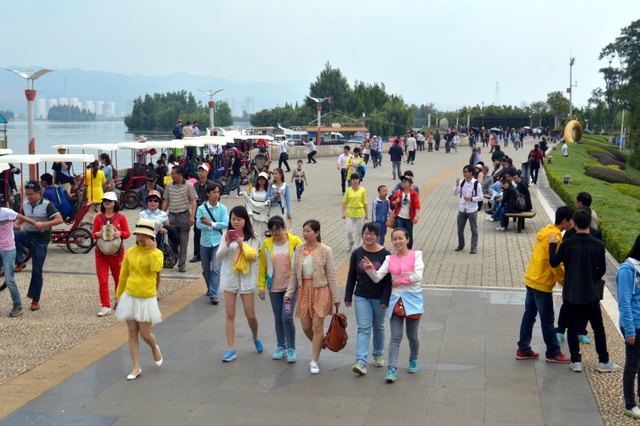 从楚雄到滇池,也花了两三个小时。站在滇池观景台上,面对我国的第六大淡水湖、素有高原明珠之称的五百里滇池,面对如黛的远山——睡美人,面对万顷碧波之上自由翩飞的鸥鸟,老师们争分夺秒拍照留念。本次旅游所剩景点已经不多,全体老师也在这里再次集体留影。