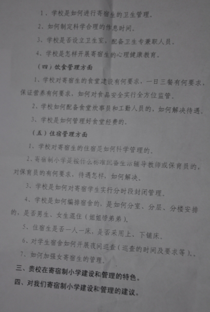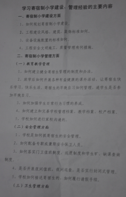 客人们对这次考察非常重视,打印好提纲,带着问题,有的放矢。考察的内容包括寄宿制小学建设、管理、正源特色、对永兴的相关建议等四大块,涵盖建设规划、风格、建筑与装饰标准、设备设施配置标准、安全文明施工与质量管理、教育教学管理、学生安全管理、卫生管理、饮食管理、住宿管理等9个方面28个问题。