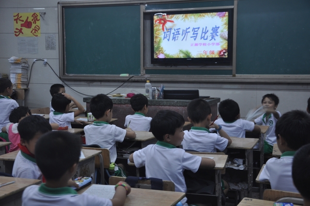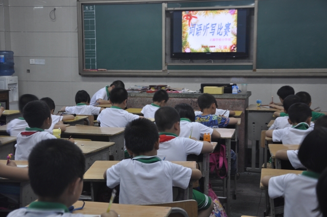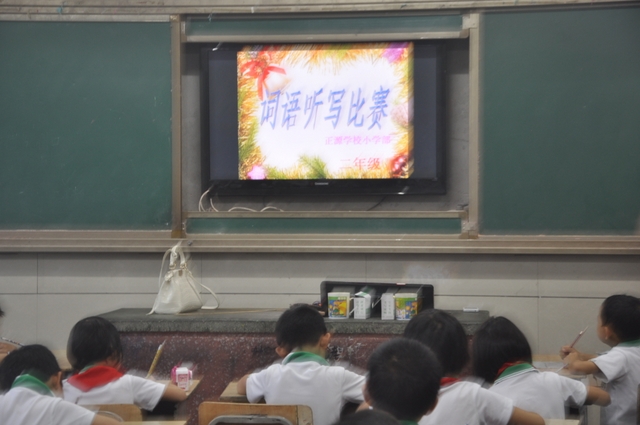 5月29日晚,小学部二年级举行词语听写大赛,全体学生参加。同学们在各自座位上,统一听着录音,工工整整地写下词语。通过激烈的角逐,曹心怡、李智同学获得了“听写王”的称号, 陈欣、罗浪涛等10位同学荣获一等奖。