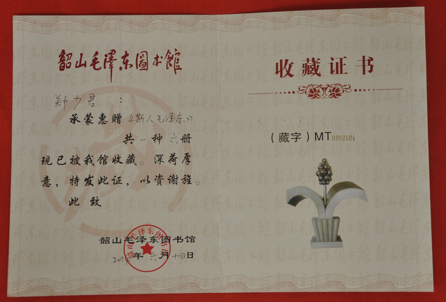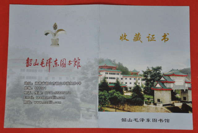 韶山毛泽东图书馆收藏证书