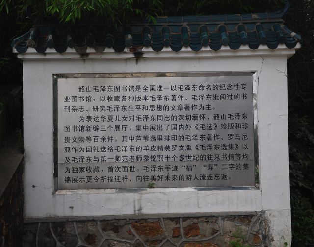 韶山毛泽东图书馆是经中共中央批准、江泽民同志题写馆名的纪念性专业图书馆,是韶山革命纪念地的重要组成部分,是进行革命传统教育的重要基地,旨在建成“毛泽东思想研究资料中心”,现已成为湘潭大学毛泽东思想研究信息中心。