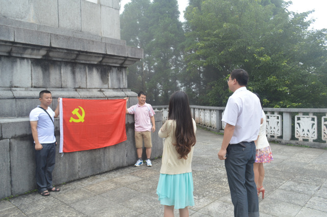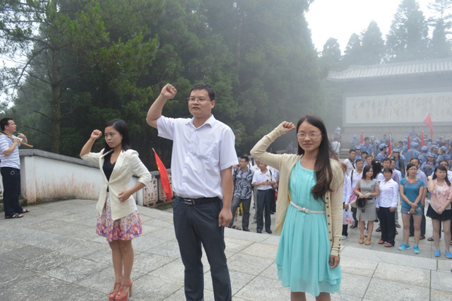 28日早上8时,紧张而又充实的参观学习活动开始了。在党旗的指引下,我们随景区的观光车参观了大井村毛泽东旧居、井冈山国家级杜鹃花博览园、红军造币厂、百竹园、小井红军医院旧址和黄洋界哨口。在黄洋界巍然耸立的“星星之火可以燎原”纪念碑前,初中部的王锐、刘明和谢菲三位老师作为预备党员,在学校党支部委员周文根的领誓下,庄严宣誓。老党员也在这里重温了誓词。