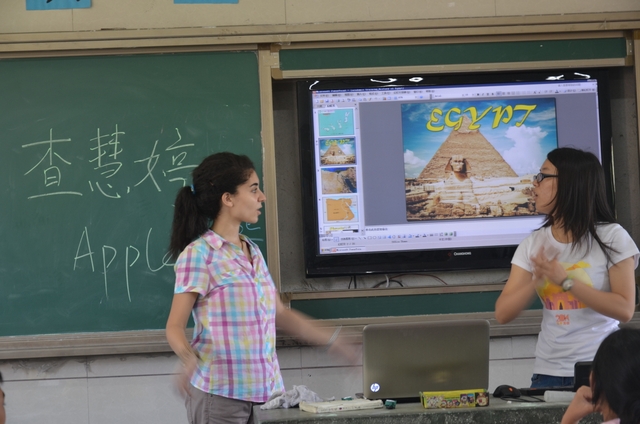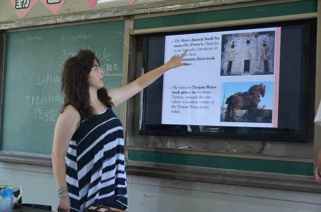 来自土耳其的国际志愿者Dilara和来自埃及Mahi在她们的“首场秀”中则介绍了本国的历史及风土人情。Dilara更是把从遥远的家乡带来的土特产与同学们一一分享。来自柬埔寨的Phily却另辟蹊径,从大家熟悉的中国地图谈起,大家纷纷发言,介绍自己及自己的家乡。来自英国的Jasmines是个英籍华人,为了丰富同学们作文中的感情,和同学们交流起了诗歌。Malek,这位来自突尼斯的年轻姑娘和同学们谈起简单的英语语法,生动的图文并茂的例子,让同学们收益匪浅。