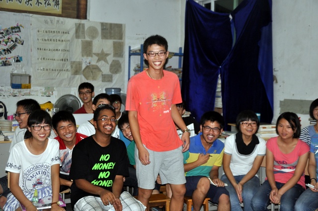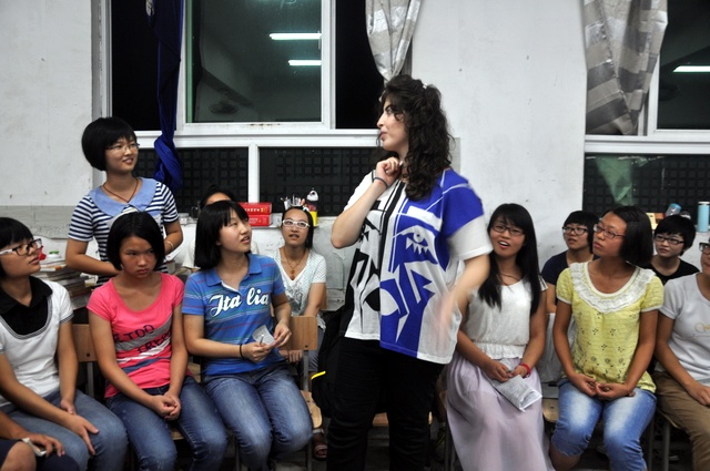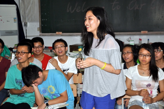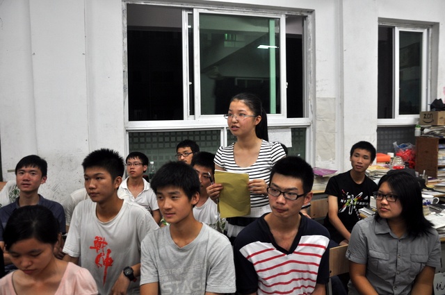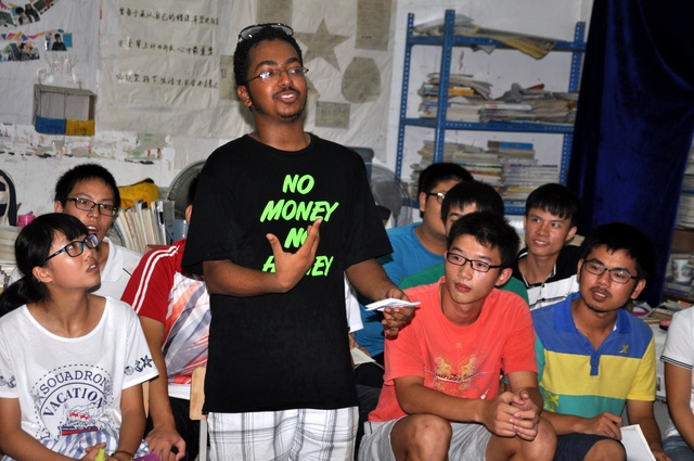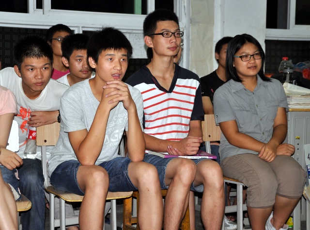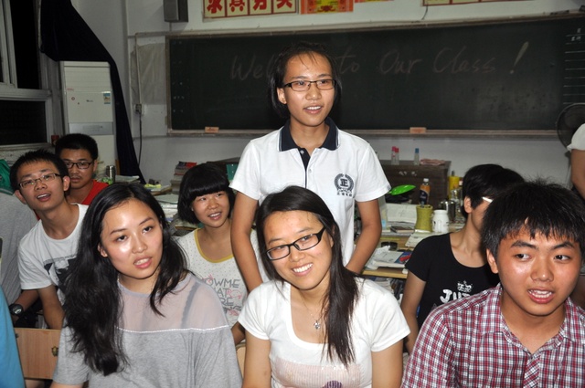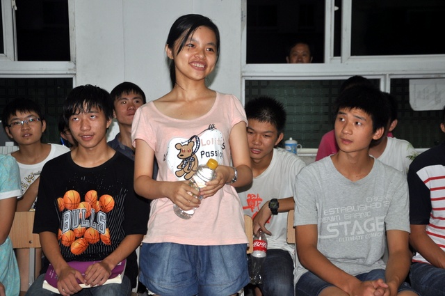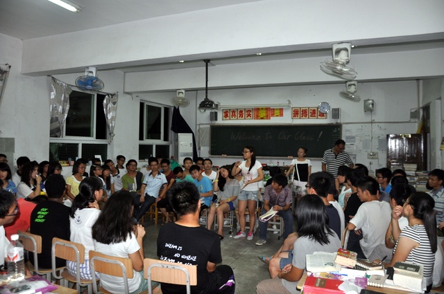 终于,七点半时,志愿者们如约而至。在雷动的掌声中,他们开始自我介绍。五位志愿者分别来自土耳其(女)、阿曼(男)、英国(女,港裔)、台湾(男)、安徽(女,清华大学直博)、海南(女,清华大学大一学生)。他们每个人的英语发音都清晰准确,为了照顾同学们,他们的语速都不快,大家听得也很轻松,不时传出会心的笑声。第二个环节是自由提问。面对着不同的问题,志愿者们不仅出语幽默,应对自如,而且还经常伴随着丰富的表情和夸张的肢体语言,引爆一阵阵大笑。最后,热心的同学们不拘泥于形式,自动以志愿者为圆心,形成一个个密切交流的小圈子,零距离交流,面对面交谈。