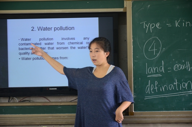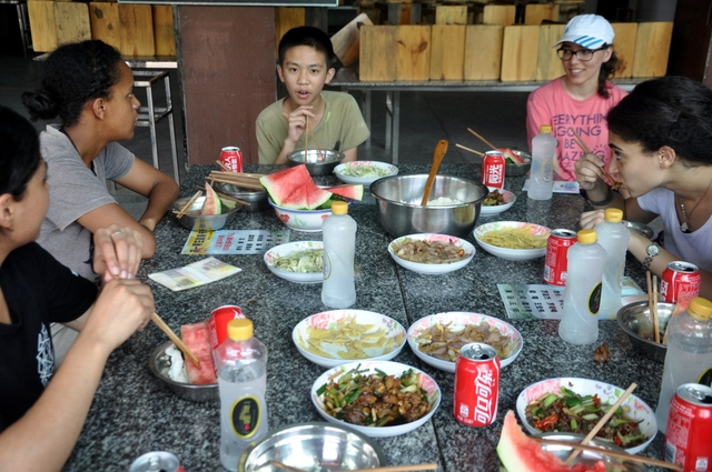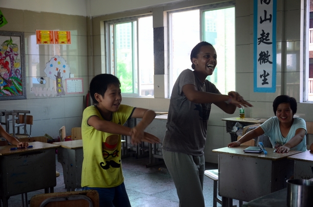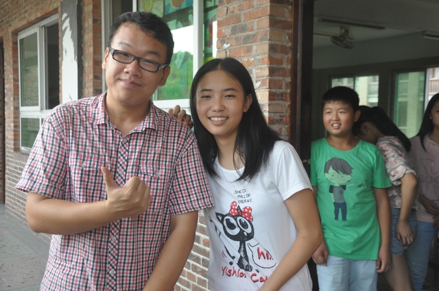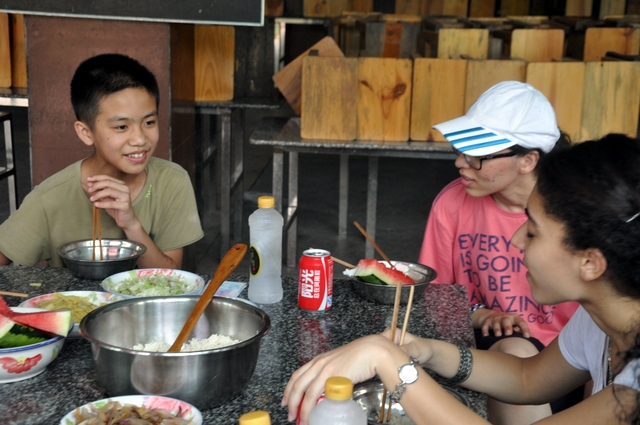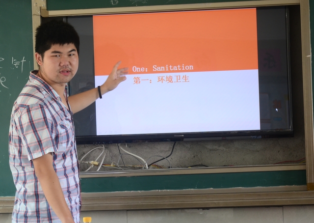 13班的高尧,这个自信阳光的男孩今天已是寝食不安,中晚餐就餐时,竟“死皮赖脸”的坐到外籍志愿者的餐桌上,与志愿者们一同吃饭,锻炼口语能力。其“醉翁之意不在酒”,就在乎能有更多的时间与志愿者交流。高尧很喜欢历史,用并不流畅的英语向志愿者介绍第二次世界大战和抗日战争。“I hate Hitler and Mussolini”引得大家哄堂大笑。来自突尼斯的Malek和来自波兰的Monika已深深地喜欢上了这位才读初一的学生。