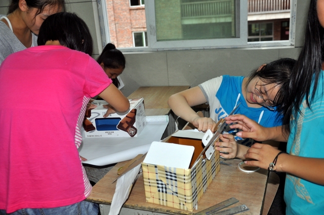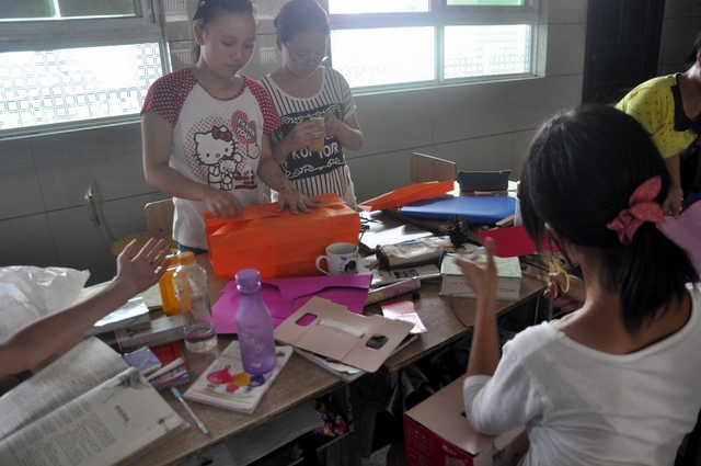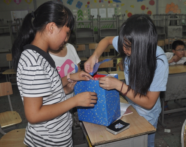 6班的资嫣等同学、13班的张美琳和雷洁等同学则忙着做精美的礼品盒送给志愿者们。8班和14班的同学们齐动员,有的剪纸,有的包装,也忙得不亦乐乎。他们也打算把自己做的、代表全班同学心愿的礼品盒送给自己心爱的志愿者。