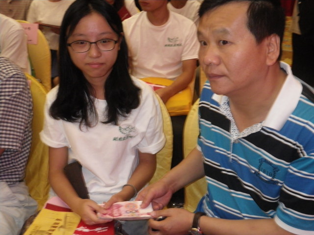 谭茜同学(原H40班)的爱心人士邓先生的家母病危在院,为了兑现爱心的承诺,“冒险”赶到活动现场把早已准备的5000元爱心助款交到谭茜的手中,主动留下了自己的联系电话并且还索求了谭茜同学的联系方式。最后郑重承诺,不管情况如何变化,每年5000元,四年不低于2万元的爱心助款一定及时到位。只有这样,邓先生才放心地离开会场,无不让人感动。