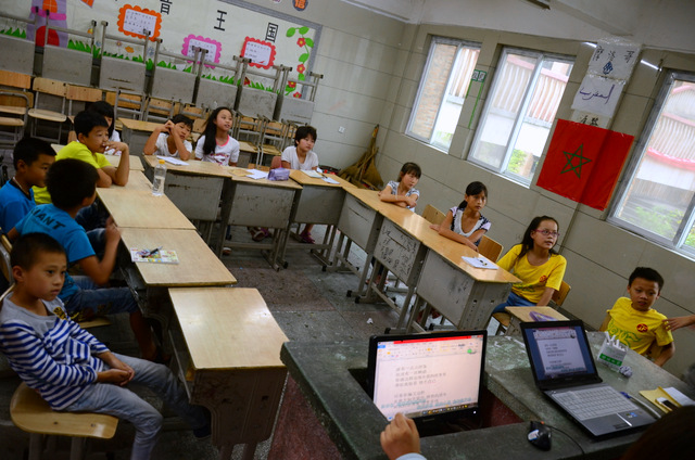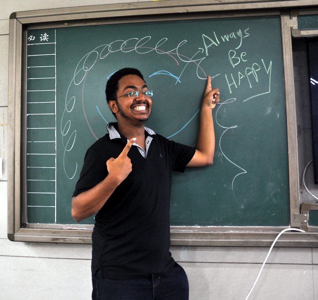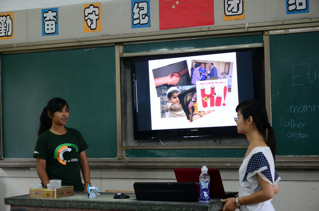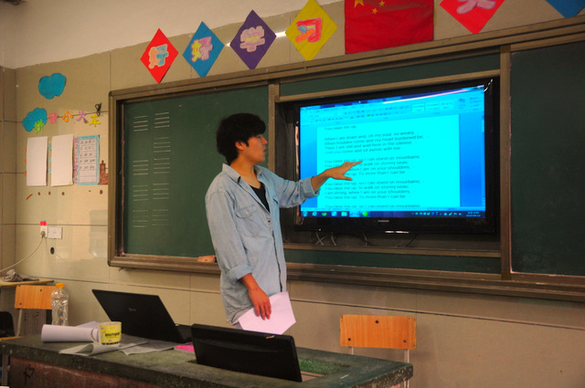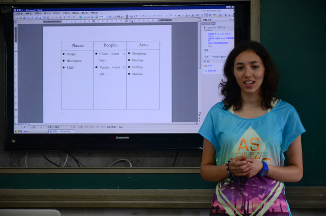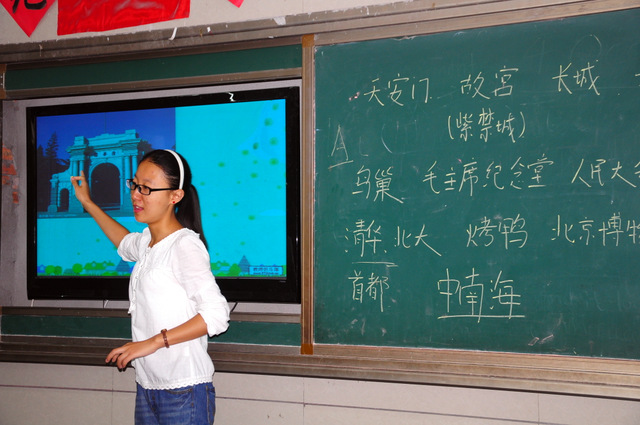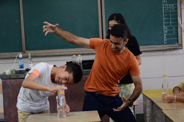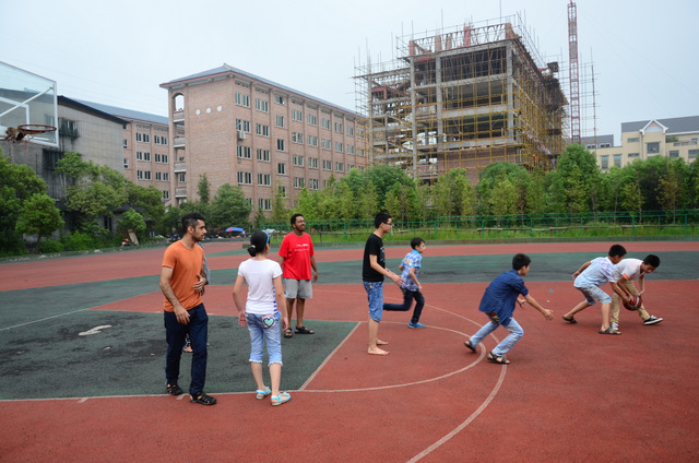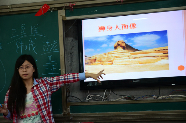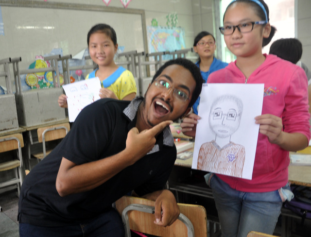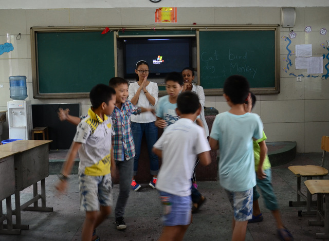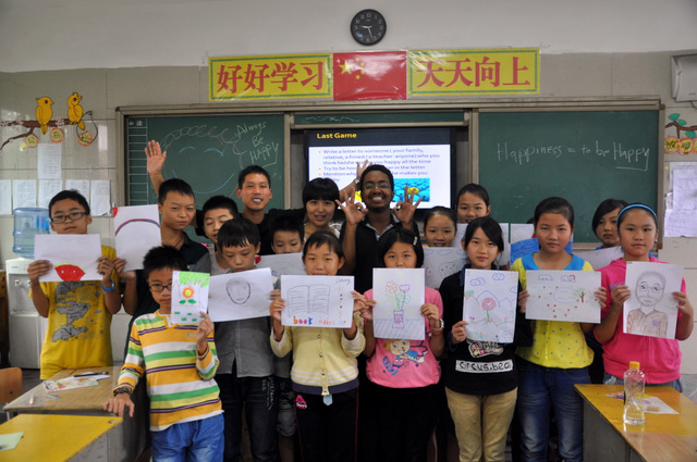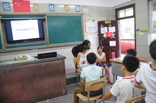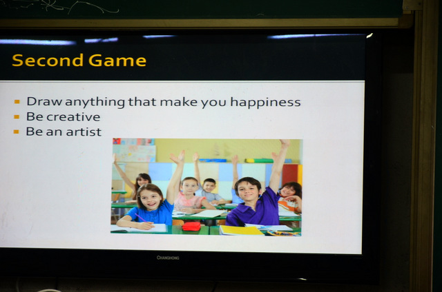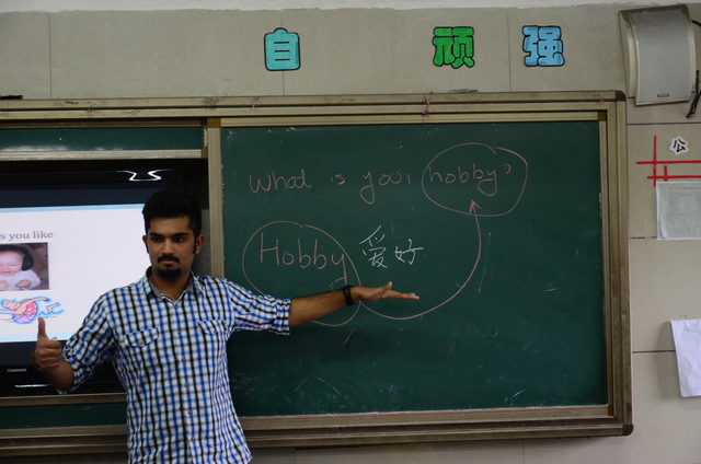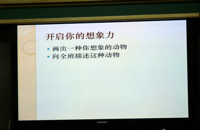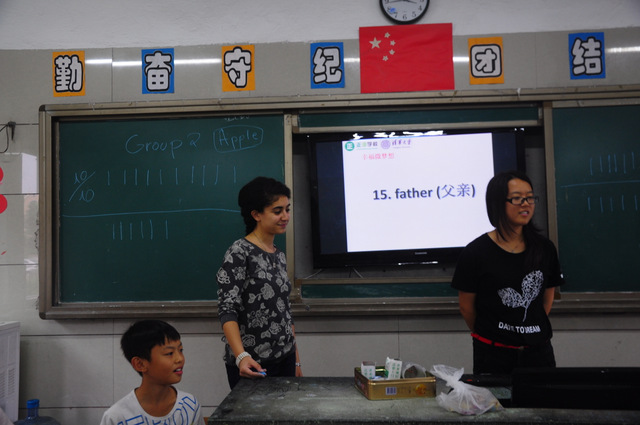 说到开心,来自埃及的马黑(Mahi)和她的中国队友查惠婷合作的“单词猜猜”游戏,那真是叫Hi!把学生分成两组,每组派出两个同学来猜单词,其他的同学集体或个人表演已给出单词的意思,让自己的队友来猜。课堂相当活跃,孩子们学英语的积极性和激情如同钱塘江水涨潮,一个劲地说“House! Chair! Bird!……”