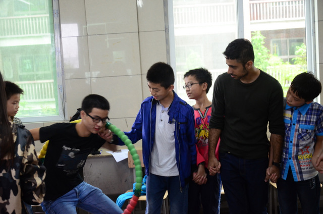 “Amazing Race”翻译成中文是“奇妙旅程”的意思。它和上次的“Global Village”(地球村)一样打破了传统的教室和班级的限制,以游园的形式来完成,是对课堂的彻底革命。把原来的13间教室缩减成5间,这5间教室就构成了本次奇妙旅程当中的5个驿站。每个驿站设一道“关卡”------须全班同学共同合作完成的游戏。这5个游戏分别是“逗笑主人”、“纸槽接龙滚乒乓球”、“手拉手过呼啦圈”、“手指相接传戒子”、“抗干扰数纸片”。
