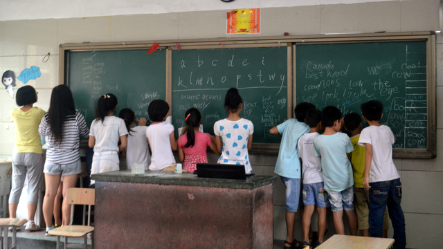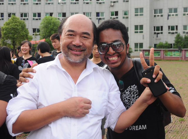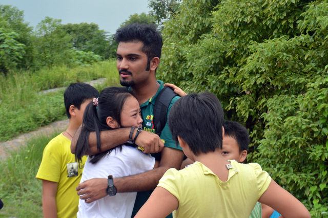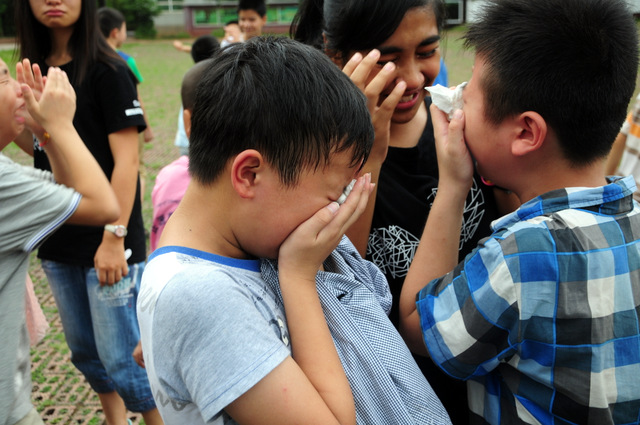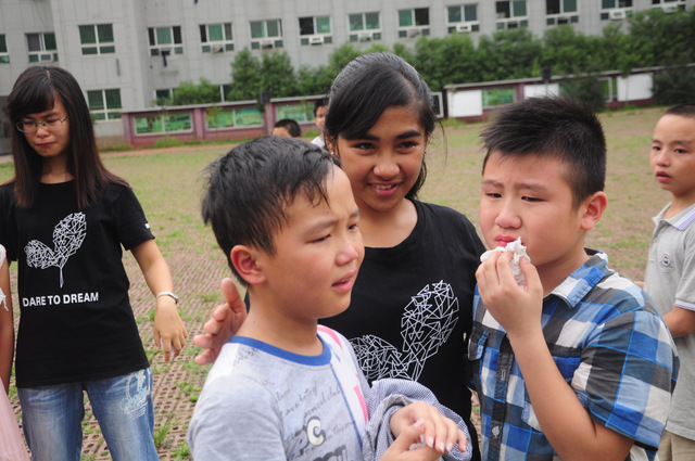 拍完合影后,要求全体志愿者留下,所有的学生回教室。但是,这时不知哪个学生冒出一句:“我们回教室,那志愿者老师们就要回去了。”这下晴天霹雳了,这些孩子们更是黏着志愿者不放了,抱得紧紧的,生怕他们心爱的老师们溜走,似乎他们还没有享受够幸福和快乐,于是孩子们的抽噎声上来了。先是小雨淅淅沥沥,然后雨越下越大,最后下起了滂沱大雨,特别是马来西亚Kish班上的两个男孩更是哭成个泪人似的。