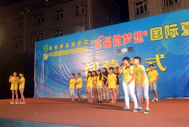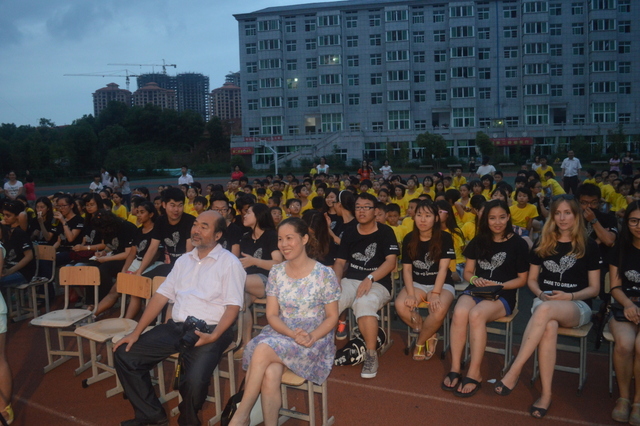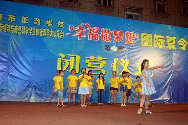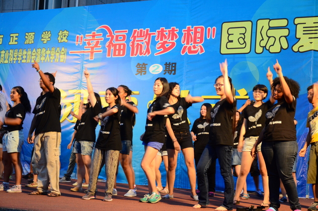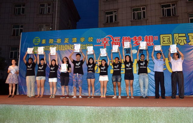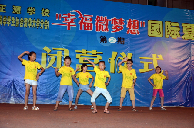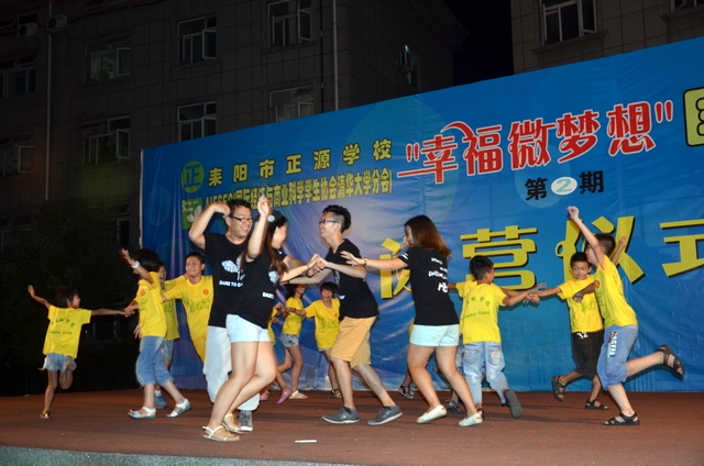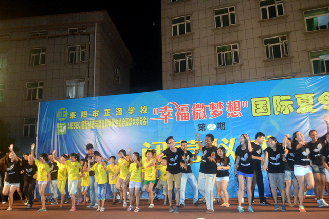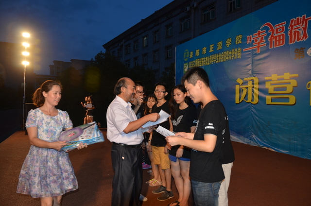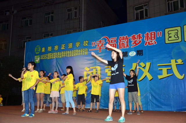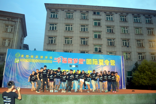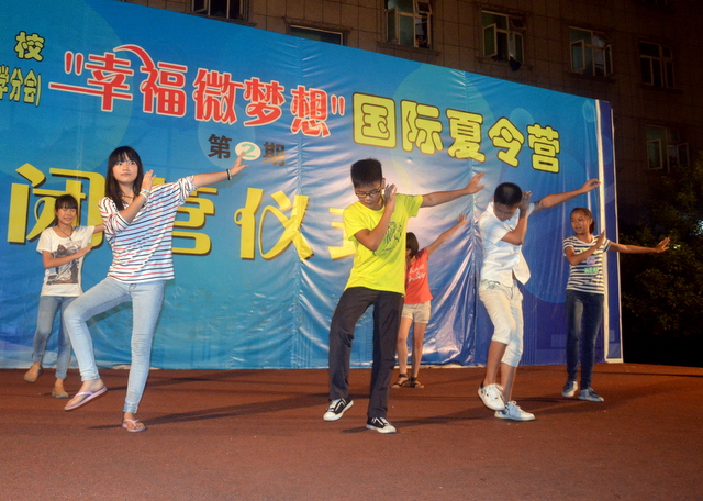 晚上7点,中外志愿者大学生在《Timber》和《绿光》欢快而奔放的舞蹈中开启了我校“幸福微梦想”夏令营(第二期)的闭幕仪式。仪式由来自中国青年政治学院的徐萍和来自清华大学的苏莹主持。校长罗湘云、培训部主任刘静、宣传处主任王英林等出席了仪式。