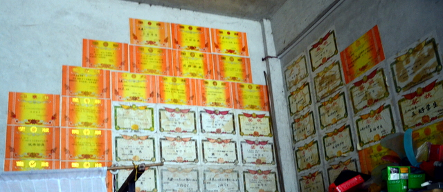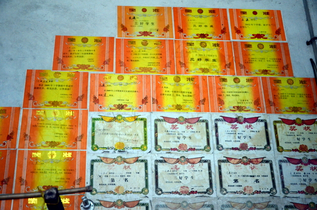 饭后,罗校长亲率所有的随从人员,在文通家长的指引下参观了文通同学历年来的光荣榜。在他家大厅的墙壁上镶满了“金砖”,罗校长打趣地把它称之为“光荣墙”,这全是文通同学从初中到高中六年来即进入我校后的奖状。