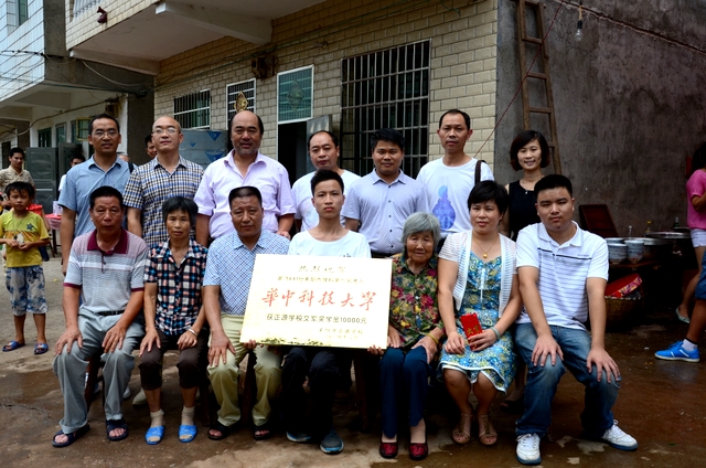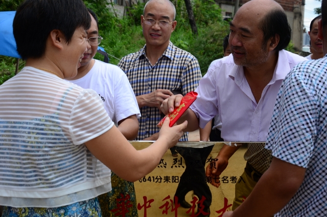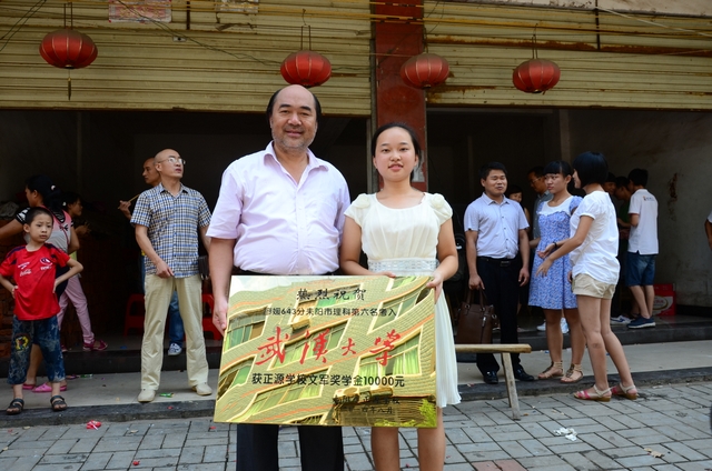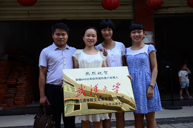 今天,考入华中科技大学的谢飞和考入武汉大学的廖媛两家分别在五里牌锡里村和新市镇摆设谢师宴,罗校长率学校领导和高三老师前往祝贺,并分别为两位学生各颁发10000元“文军奖学金”及奖牌。