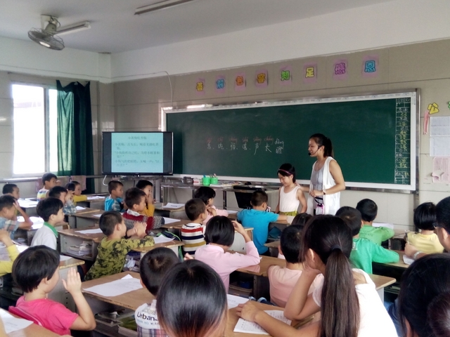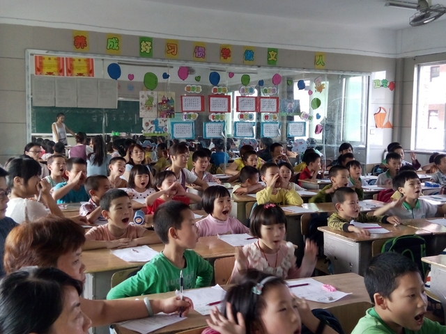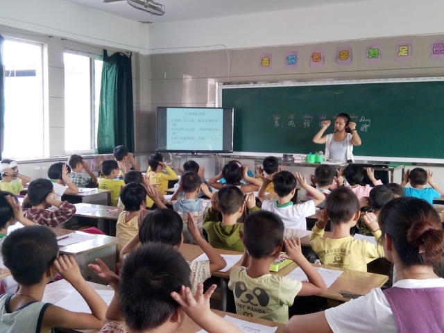 而后,王老师带大家学习了《小黄狗吃香肠》儿歌,从普通话学习、从轻声、从语气、从表情、从动作等等方面,对学生进行了系列的指导和训练。学生在这堂课里完全得到了放松,他们敢大声读,大声说,敢学小狗大声“汪汪汪”,敢学主持人上台介绍,敢上台表演……看,他们多快乐!学生乐中学,学中乐啊!