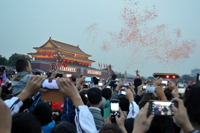 今日的天安门广场花团锦簇,喜气洋洋,一派祥和的景象深入人心。6点10分,五星红旗伴随着雄壮的国歌声冉冉升起,最后矗立在首都北京天安门的上空迎风飘荡。升旗仪式礼毕后,1万只白羽鸽和1万个气球一起齐飞,飞翔于蓝天之下,这预示着我们伟大祖国的明天更加美好,更加辉煌!